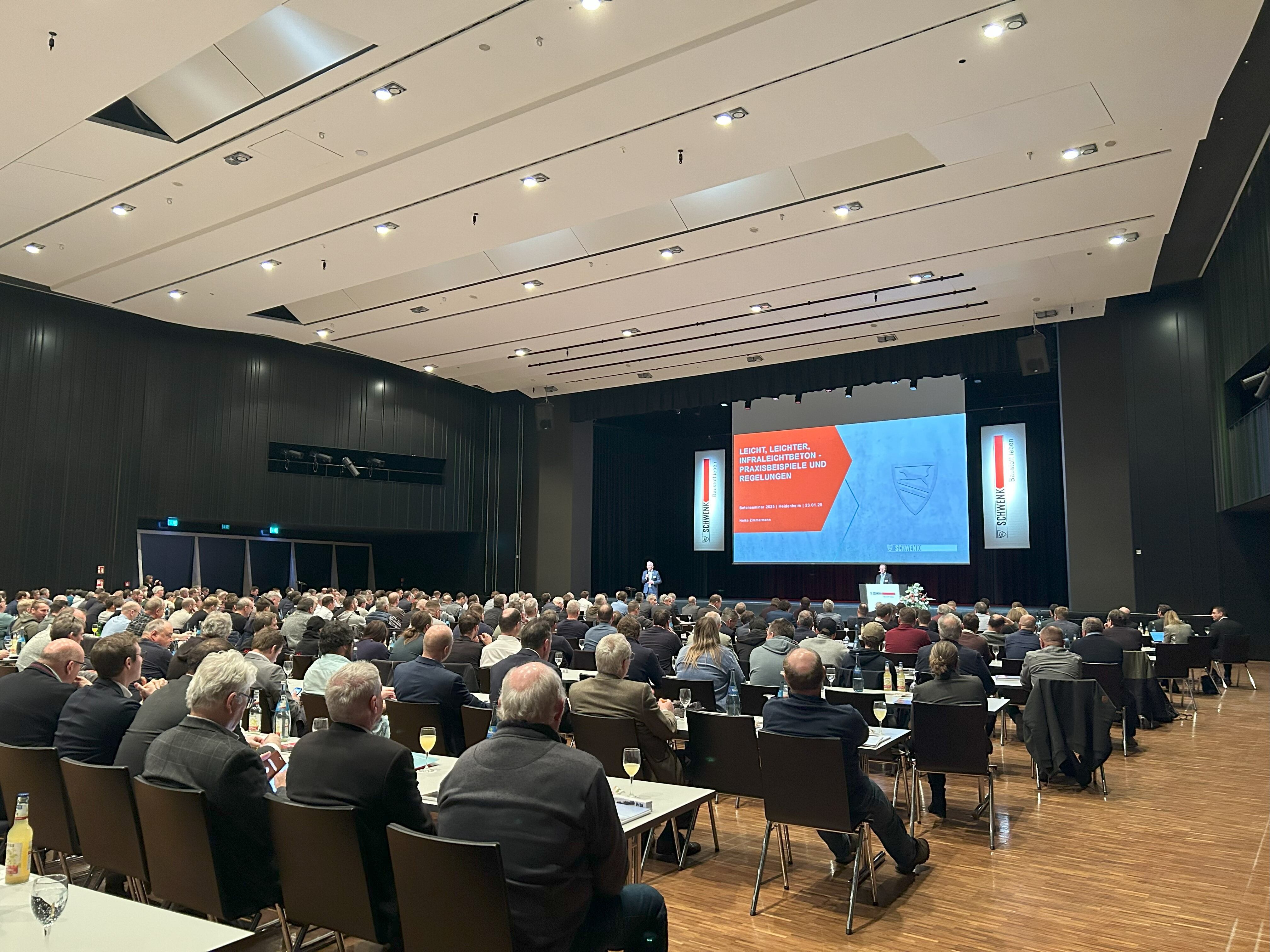 Am 23. Januar 2025 begrüßt Werner Rothenbacher, Leiter der SCHWENK Anwendungstechnik, rund 340 Teilnehmer im Congress Centrum in Heidenheim zum Betonseminar 2025. Unter den Gästen sind zahlreiche Kunden, ausschreibende Stellen, Behördenvertreter und Hochschulen.