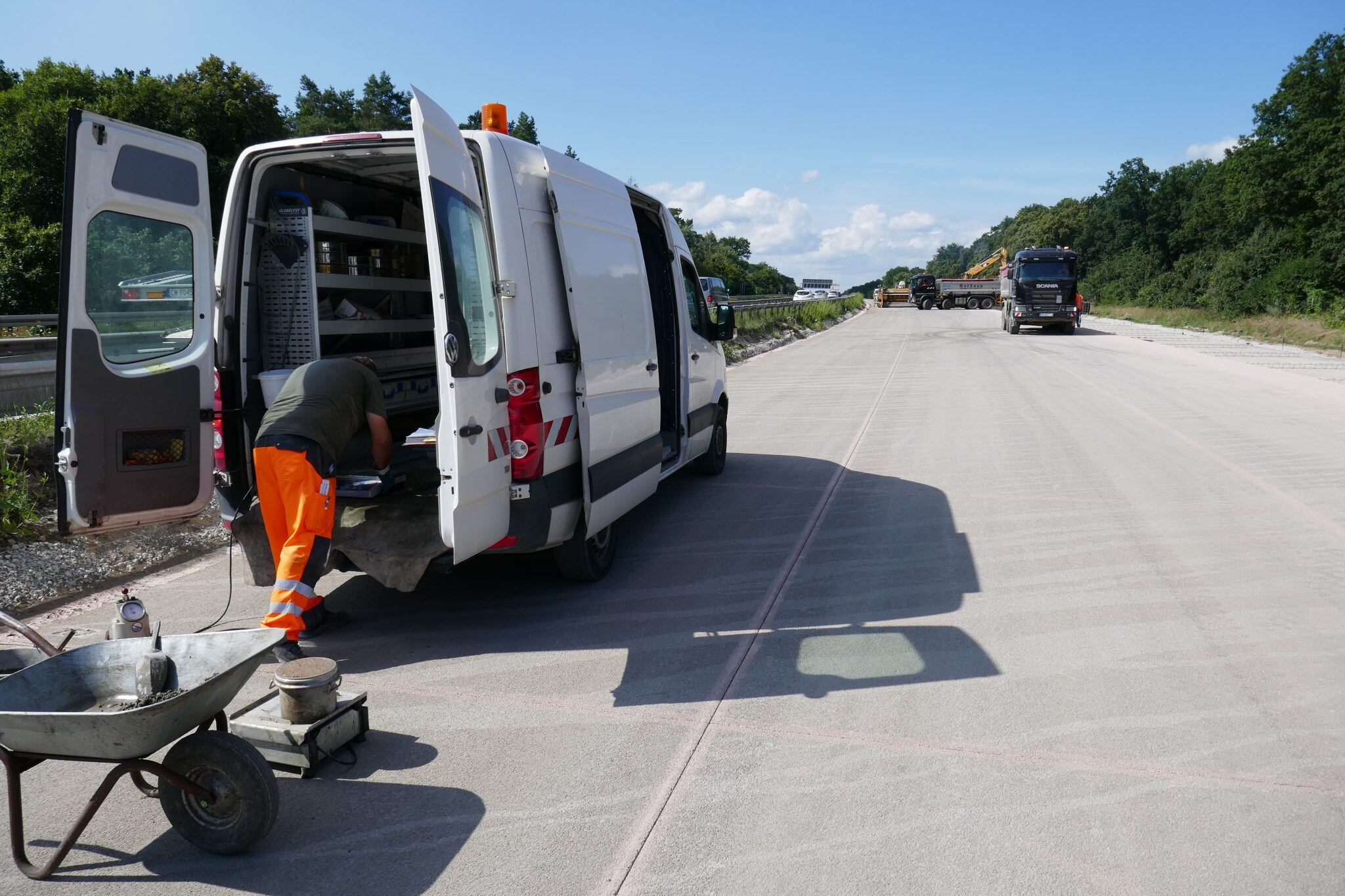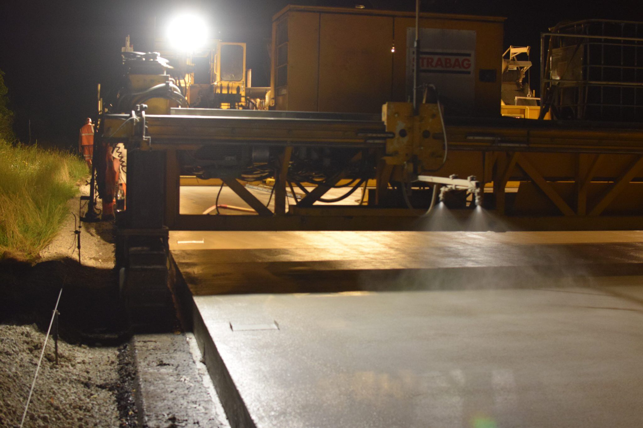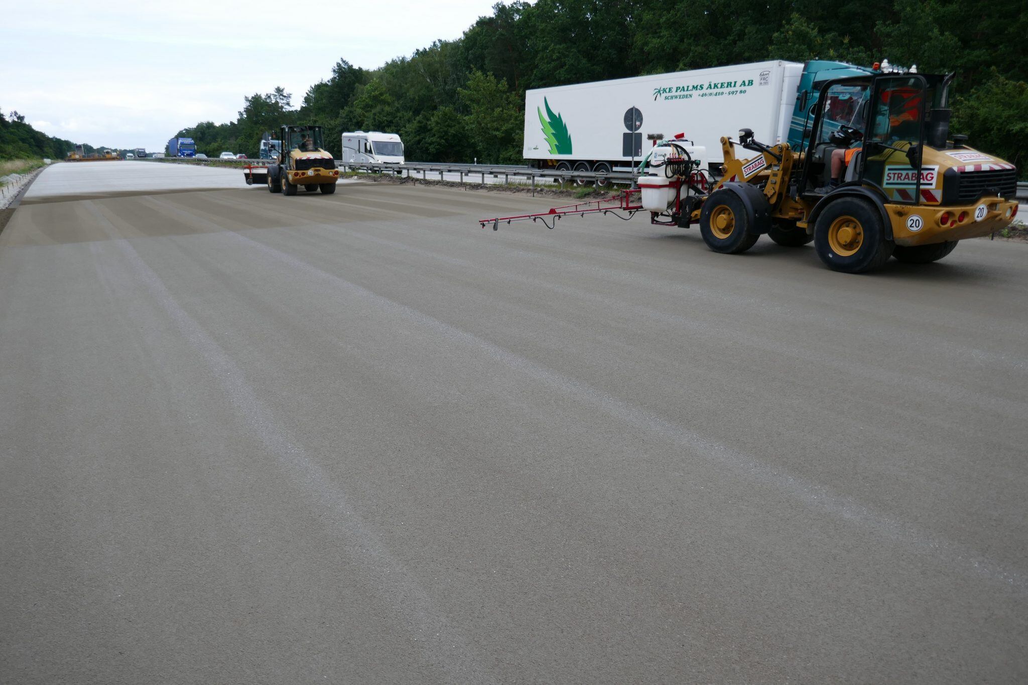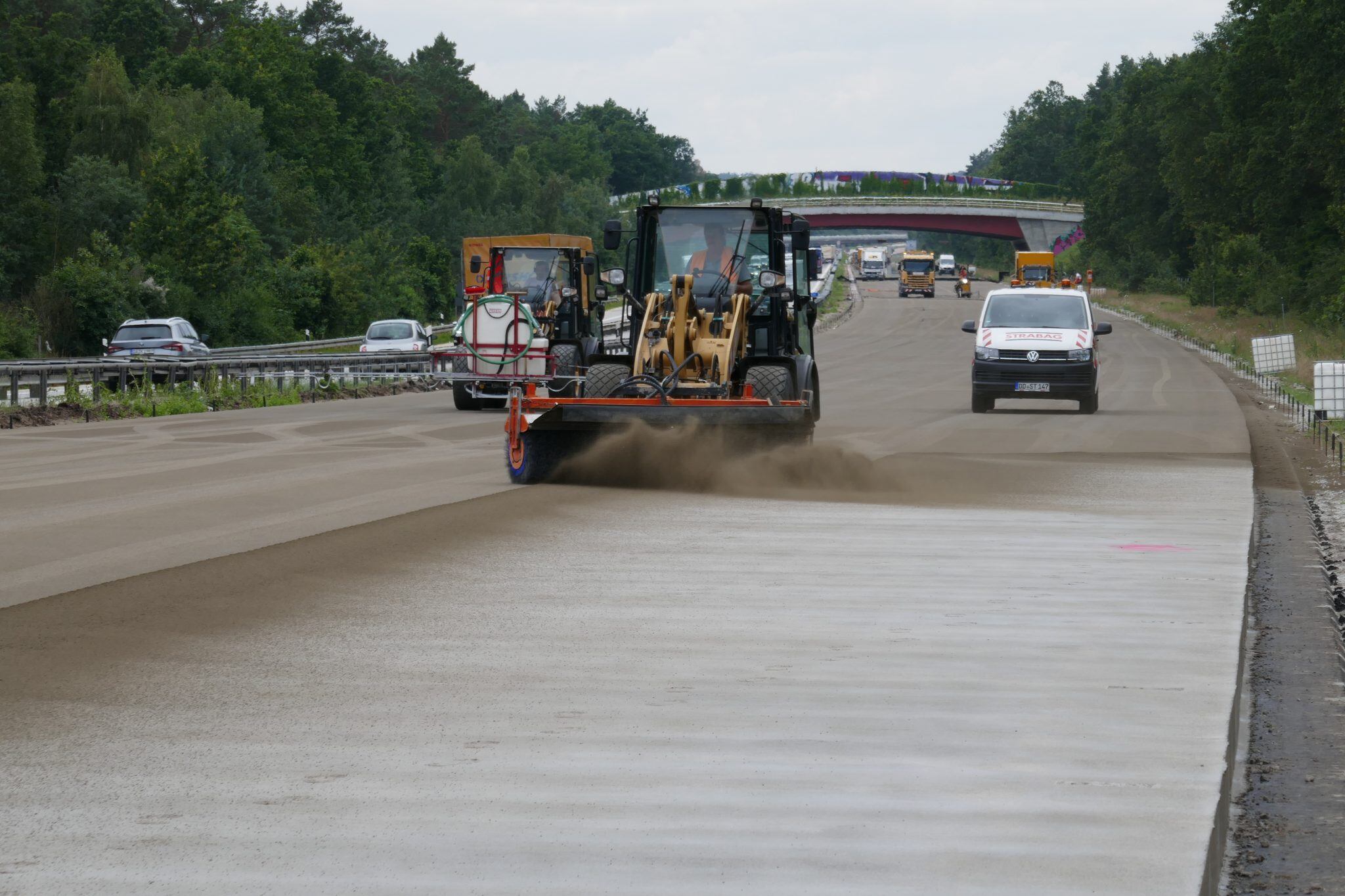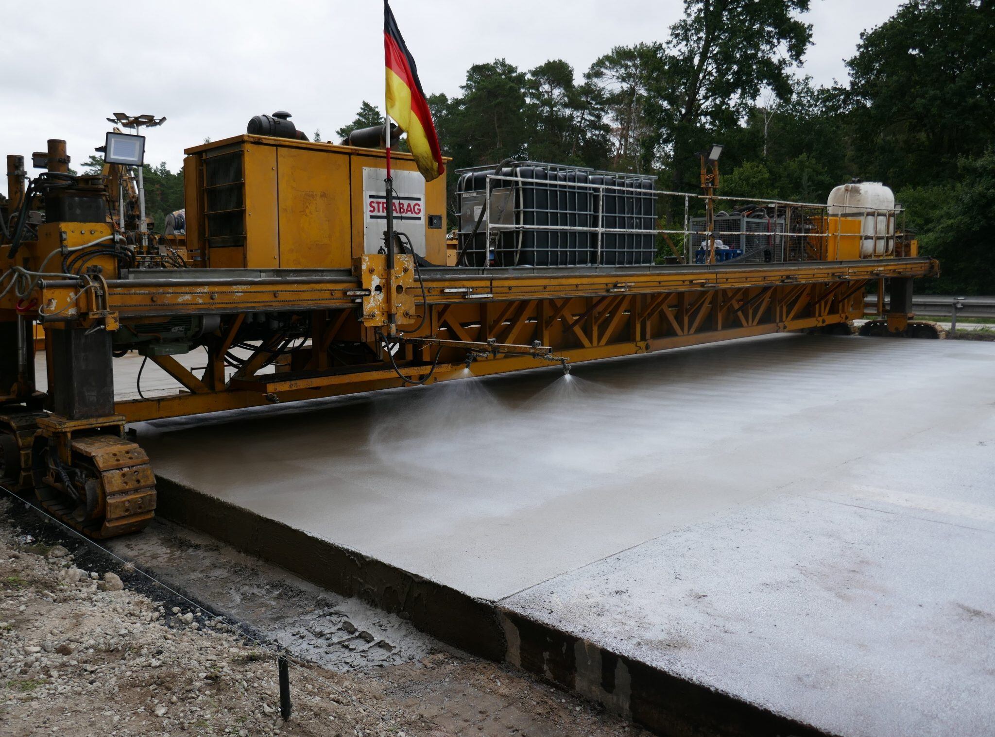 Im Anschluss an das Ausbürsten wird die fertig texturierte Betondecke nochmals mit einem Nachbehandlungsmittel entsprechend TL NBH-StB besprüht und damit vor Austrocknung geschützt. Im Laufe der Durchführung und im Anschluss wurden die Rautiefen jederzeit von der TPA überprüft und dokumentiert. Auf der Waschbetonoberfläche wurden die vom Auftraggeber geforderten Grenzwerte der Rautiefe zwischen 0,7 – 1,1 mm vor Verkehrsfreigabe alle 150 m punktuell kontrolliert und zielsicher eingehalten.