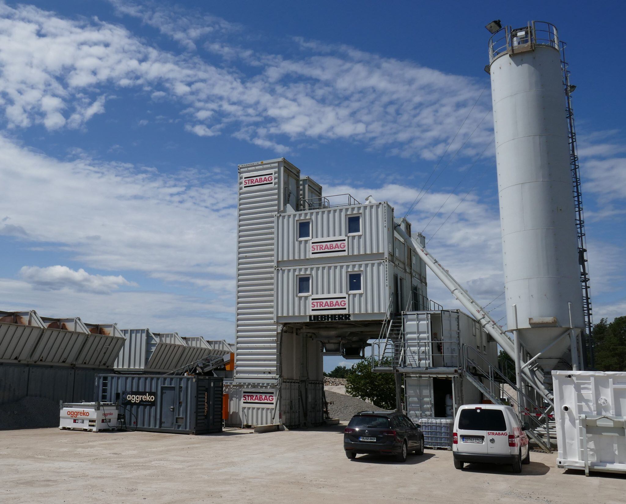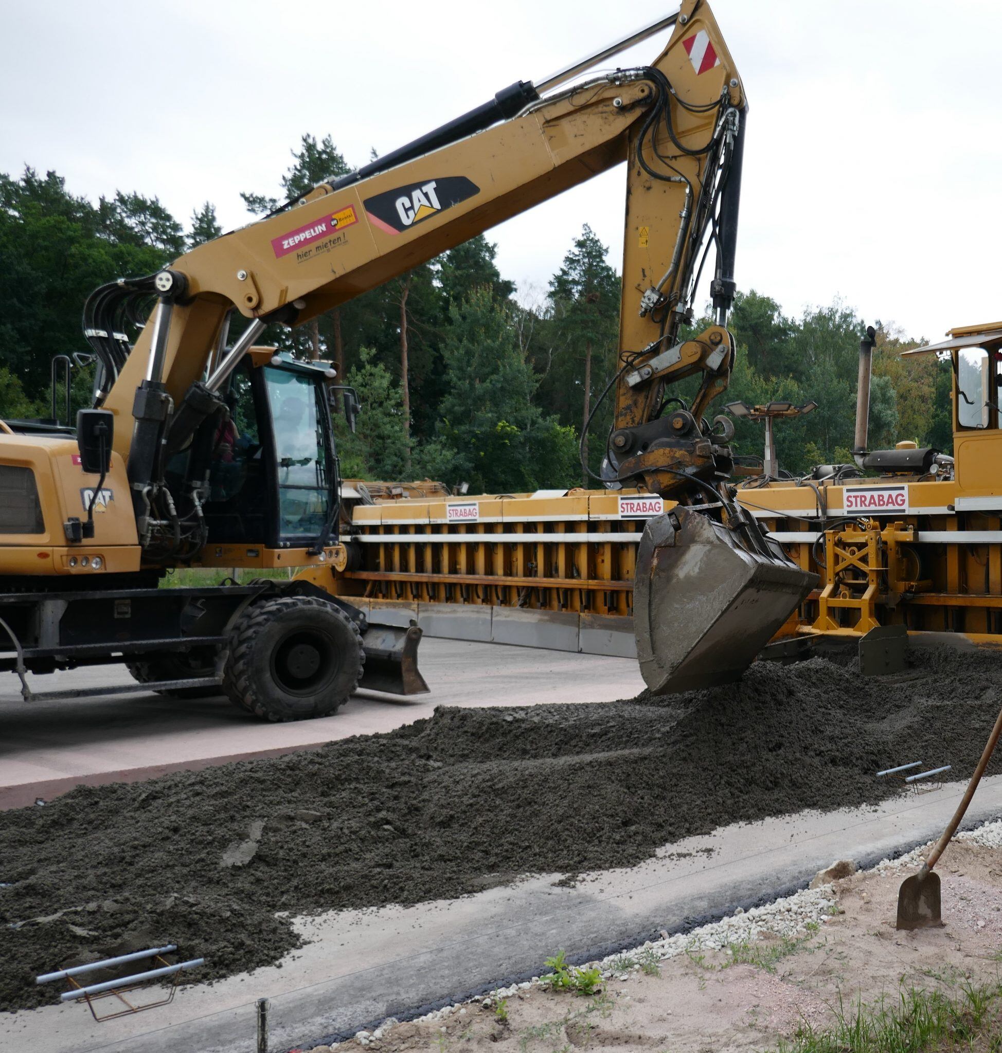 Zunächst wurde auf einer Freifläche im nahegelegenen Gewerbegebiet die mobile Liebherr-Betonmischanlage der STRABAG aufgestellt. Auf der vorbereiteten, mit ungebundenen Schichten befestigten Fläche, war ausreichend Platz für die Mischanlage und die Lagerung sämtlicher Gesteinskörnungen.