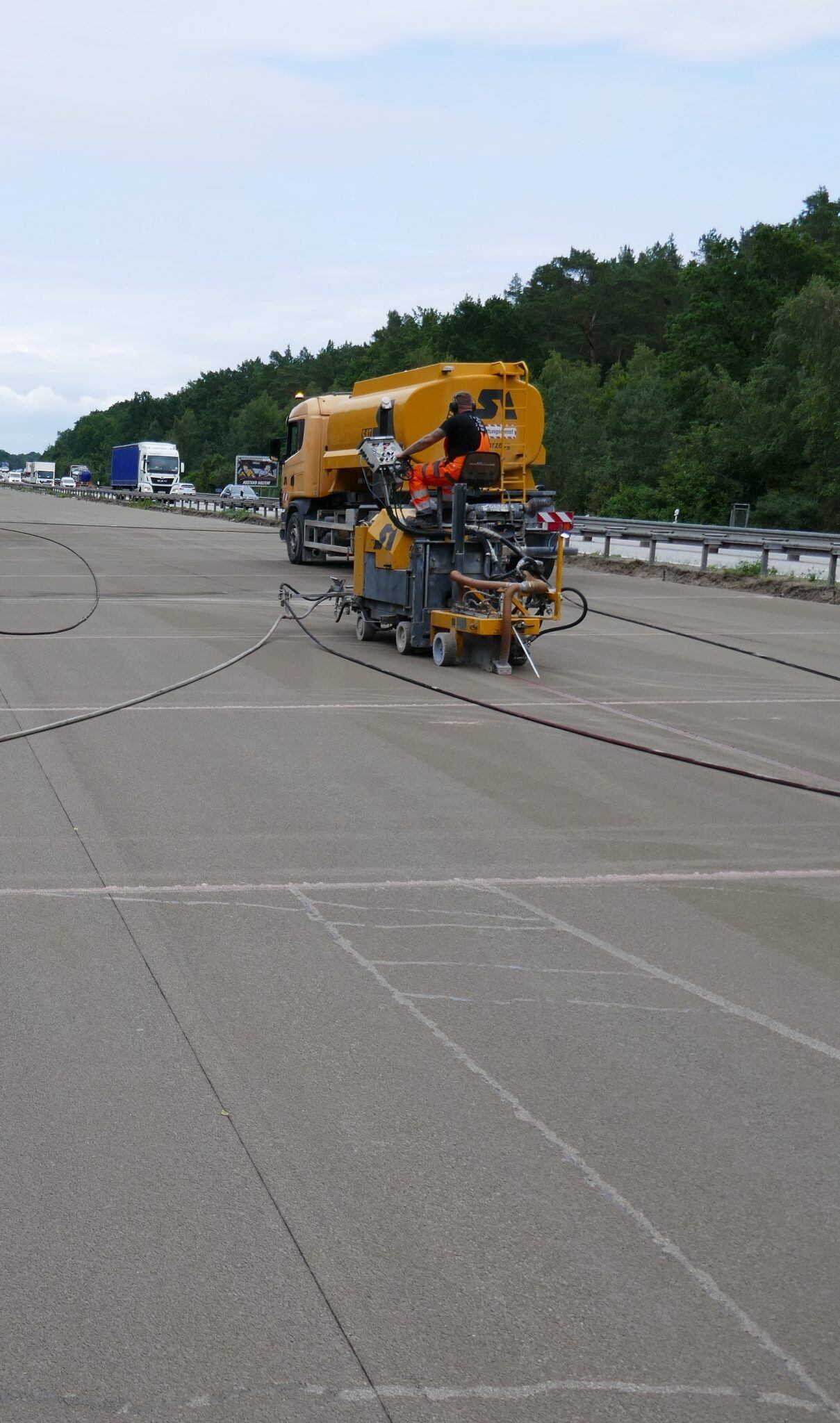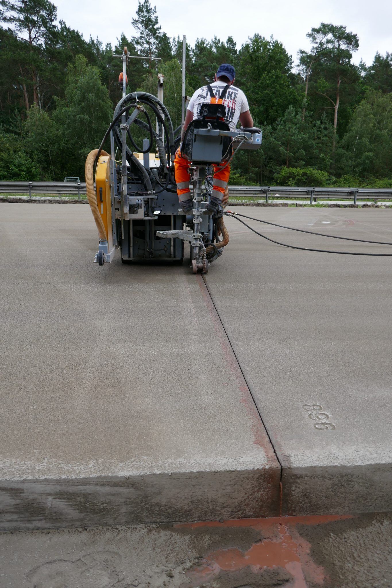 Danach erfolgten die Fugenschneidarbeiten der SAT Spezialbau GmbH nach TL FuG-StB. Hierbei werden Scheinfugen in Quer- und Längsrichtung eingeschnitten. Sie dienen zur Rissinduzierung im Fahrbahndeckenbeton, sodass an den vorgegebenen Stellen die Schwindspannungen abgefangen werden können. Die Fugen werden mit zwangsgeführten Fugenschneidern mit integrierter Absaugvorrichtung in den Beton eingeschnitten. Da das Schwindverhalten in Längs- und Querrichtung unterschiedlich ausgeprägt ist, wird in Querrichtung ein Kerbschnitt in einer Größenordnung von 25 bis 30 % der Deckendicke vorgenommen, während in Längsrichtung Schnitttiefen von 35 bis 40 % angeordnet werden. Das bedeutet, dass bei einer Deckendicke von 26 cm die Scheinfugen quer eine Schnitttiefe von rd. 7 cm und längs von rd. 10 cm aufweisen müssen. Die Feldgrößen betrugen teilweise 3,75 m x 5,00 m. Der richtige Zeitpunkt zum Schneiden der Fugen ist von der Festigkeitsentwicklung abhängig und obliegt ebenfalls der Erfahrung des Ausführenden.