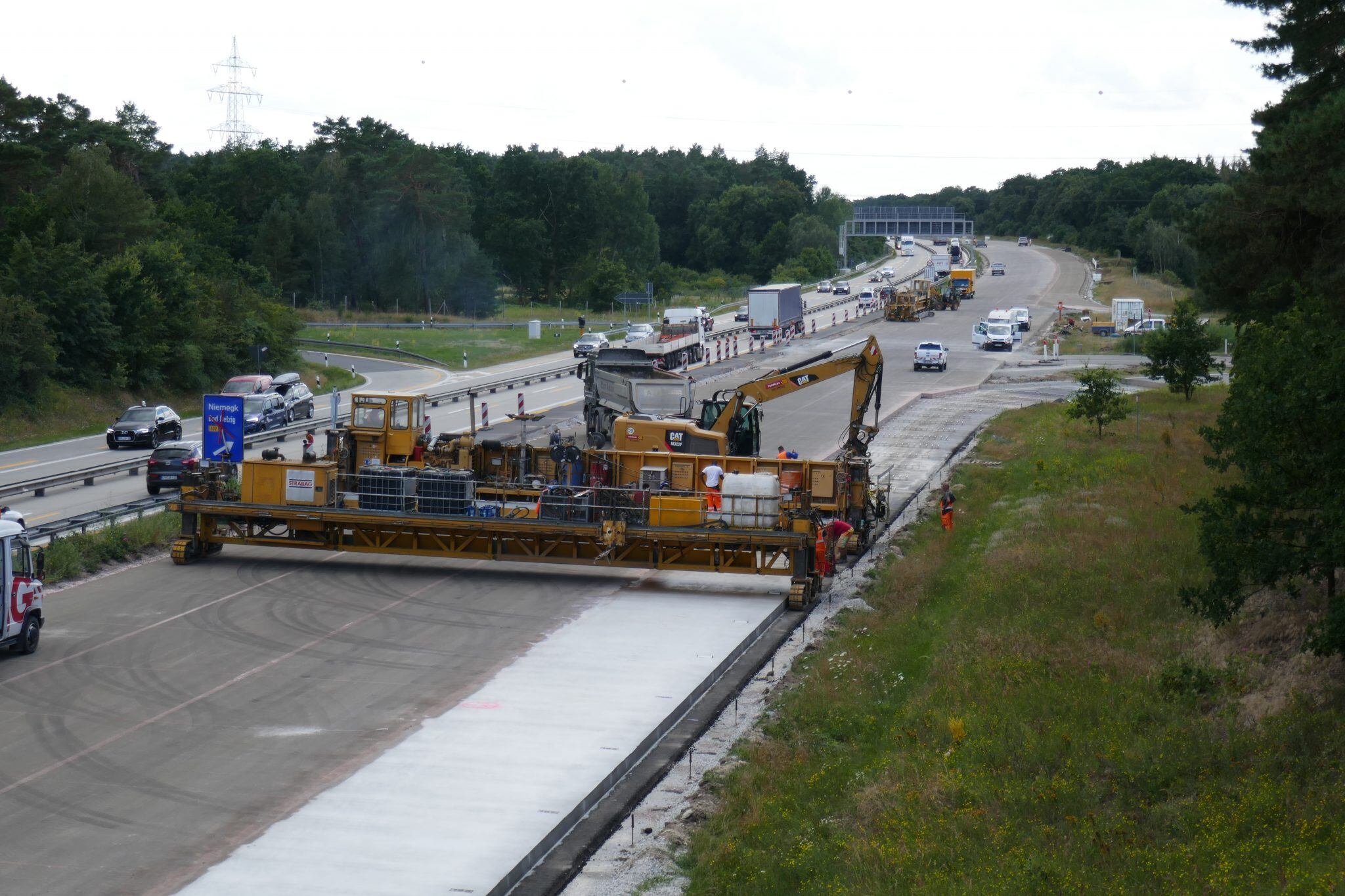 Vor dem Betoneinbau sind verschiedene vorbereitende Maßnahmen wie z.B. das Verteilen der Dübel, Anker und der Dübel- bzw. Ankerkörbe sowie das Vorhalten des flüssigen Nachbehandlungsmittels oder das Einrichten der Höhenleitdrähte zu treffen. Der Einbau des Straßendeckenbetons wurde mit einem Gleitschalungsfertiger HEILIT+WOERNER für die Einbaubreiten von ca. 15 m ausgeführt. Für die Einbaubreiten von 1,00 m bis 7,00 m, im Bereich der Beschleunigungs- und Verzögerungsspuren an der Anschlussstelle Niemegk, kam der gleiche Betongleitschalungsfertiger zum Einsatz. Weiterhin wurde für die Nachbehandlung der fertigen Betondecke ebenfalls eine Nachbehandlungsbühne eingesetzt. Die Entfernung für den Betontransport vom Mischwerk zur Baustelle betrug max. 5 Kilometer.
