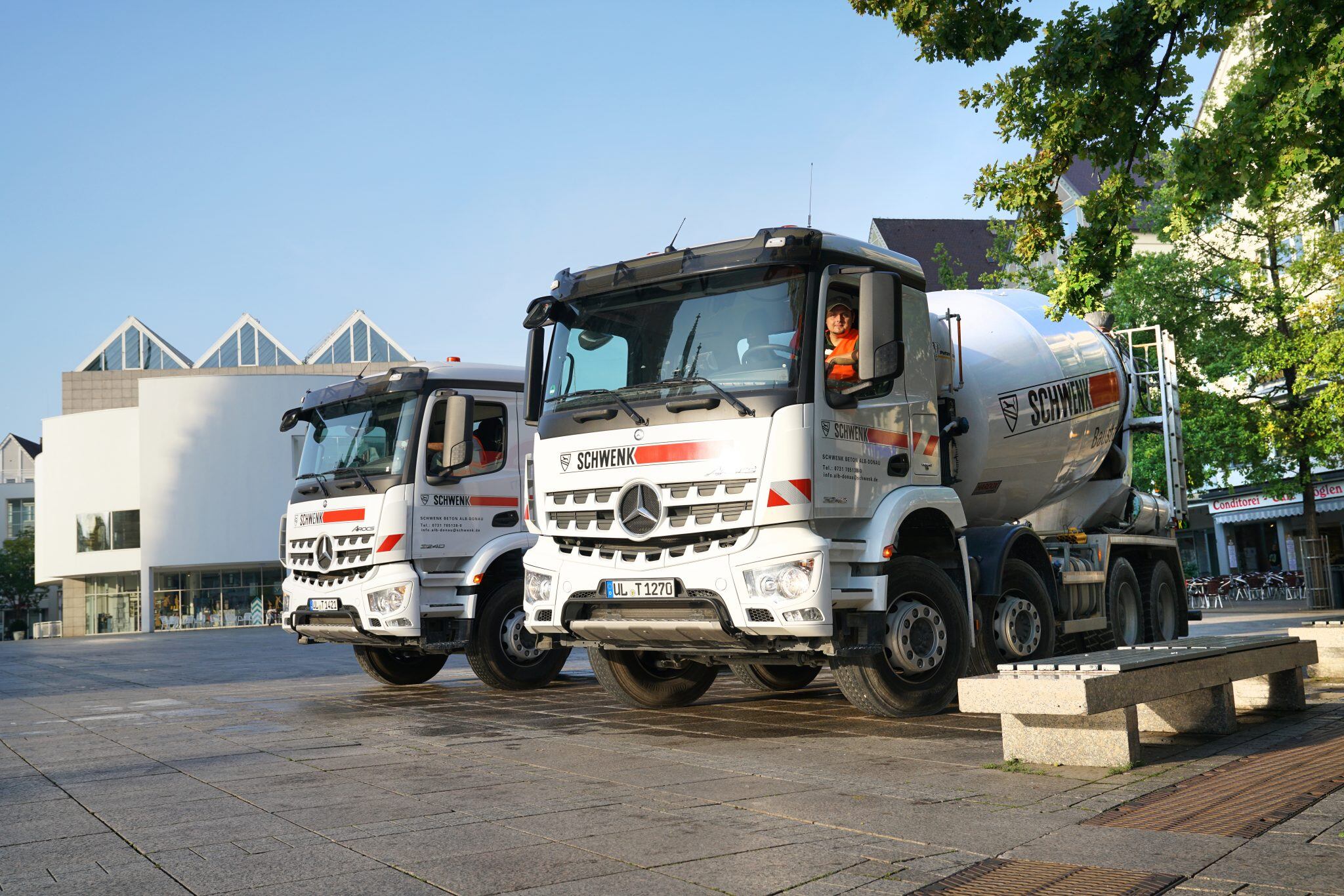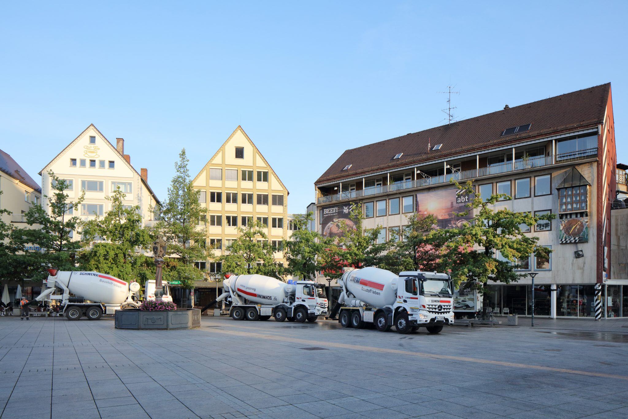Diese Chance nutzten wir, um ein paar neue Fotos für uns zu schießen. Insgesamt ein beeindruckender Anblick der so manche Passanten zum Stehen und Zusehen brachte – Die neuen Fahrmischer vor dem Ulmer Münster und im Hintergrund der Sonnenaufgang.