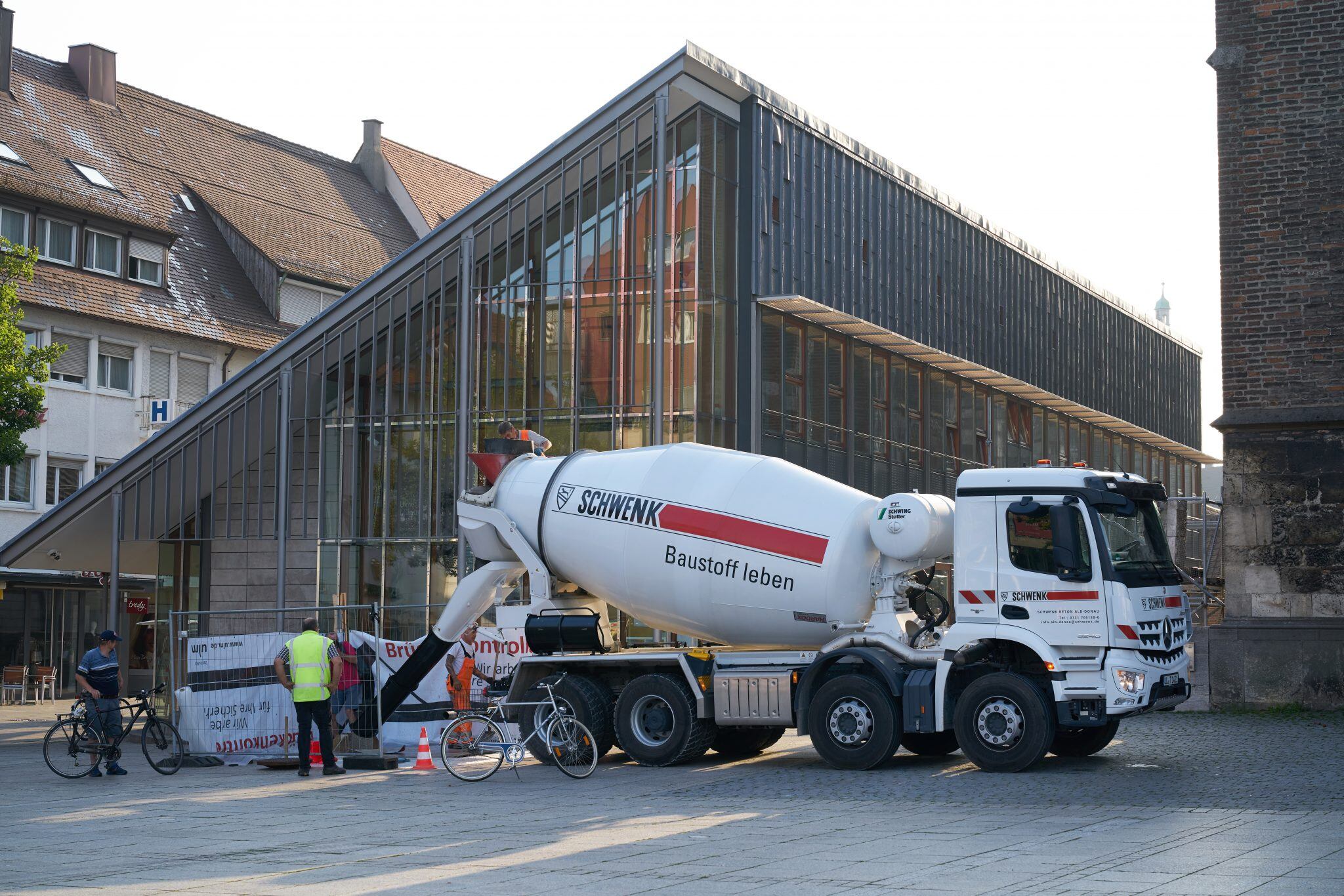 Die Stadt Ulm ließ diesen Tank unter dem Münsterplatz nun von unserer SCHWENK Beton Alb-Donau verfüllen, da er nicht mehr benötigt wird. Es wurden insgesamt ca. 240 m3 Beton in den Tank gefüllt, was ungefähr 30 Fahrmischerladungen entspricht. Die Arbeiten gingen bereits morgens um 5 Uhr los, und dauerten bis ca.10 Uhr an.