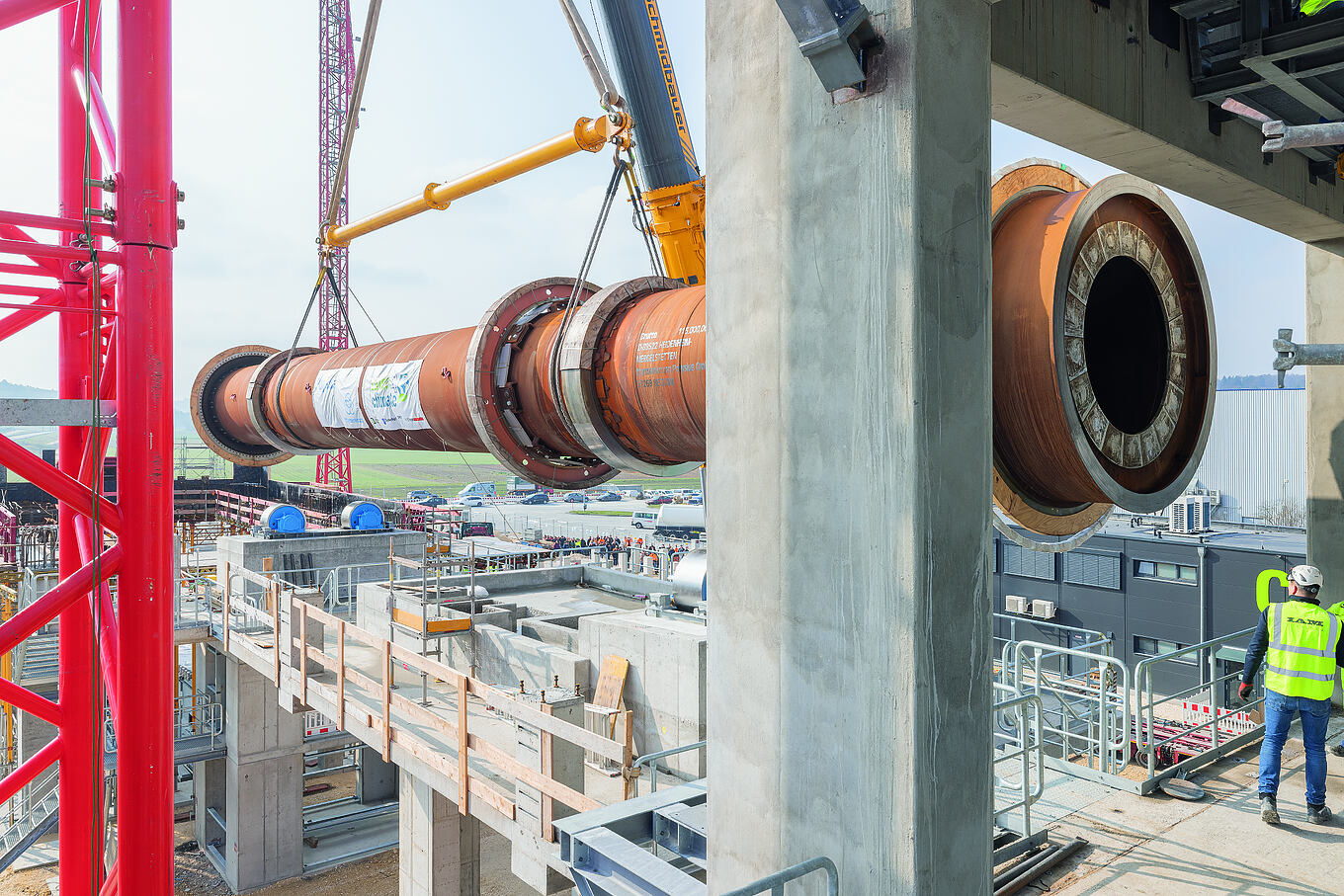 Der Drehofen wurde im Dezember 2023 per Binnenschiff auf dem Flussweg von Hamm-Uentrop bis Heilbronn-Hafen transportiert und dort zunächst zwischengelagert, bis die Bauarbeiten vor Ort zur Ofen-Montage abgeschlossen waren. Den restlichen Weg nach Mergelstetten übernahm dann ein LKW-Schwertransport während der Nachtstunden, um den Verkehr möglichst nicht zu behindern. Der Ofen ist aufgrund seiner kompakten Maße der erste, den Polysius samt Laufring und Zahnkranz in einem Stück transportiert und auf die Ofenfundamente mit einem Hub gesetzt hat. Dafür wurden im Vorfeld – neben der Ausarbeitung der Transportkonzepte – sämtliche Montageabläufe auf dem Baufeld so detailliert geplant, dass der Drehofen ohne Verzögerung mit einem Hub gesetzt werden konnte. Zum Einheben des Ofens am 7. März 2024 kam ein 700 Tonnen-Kran zum Einsatz.
