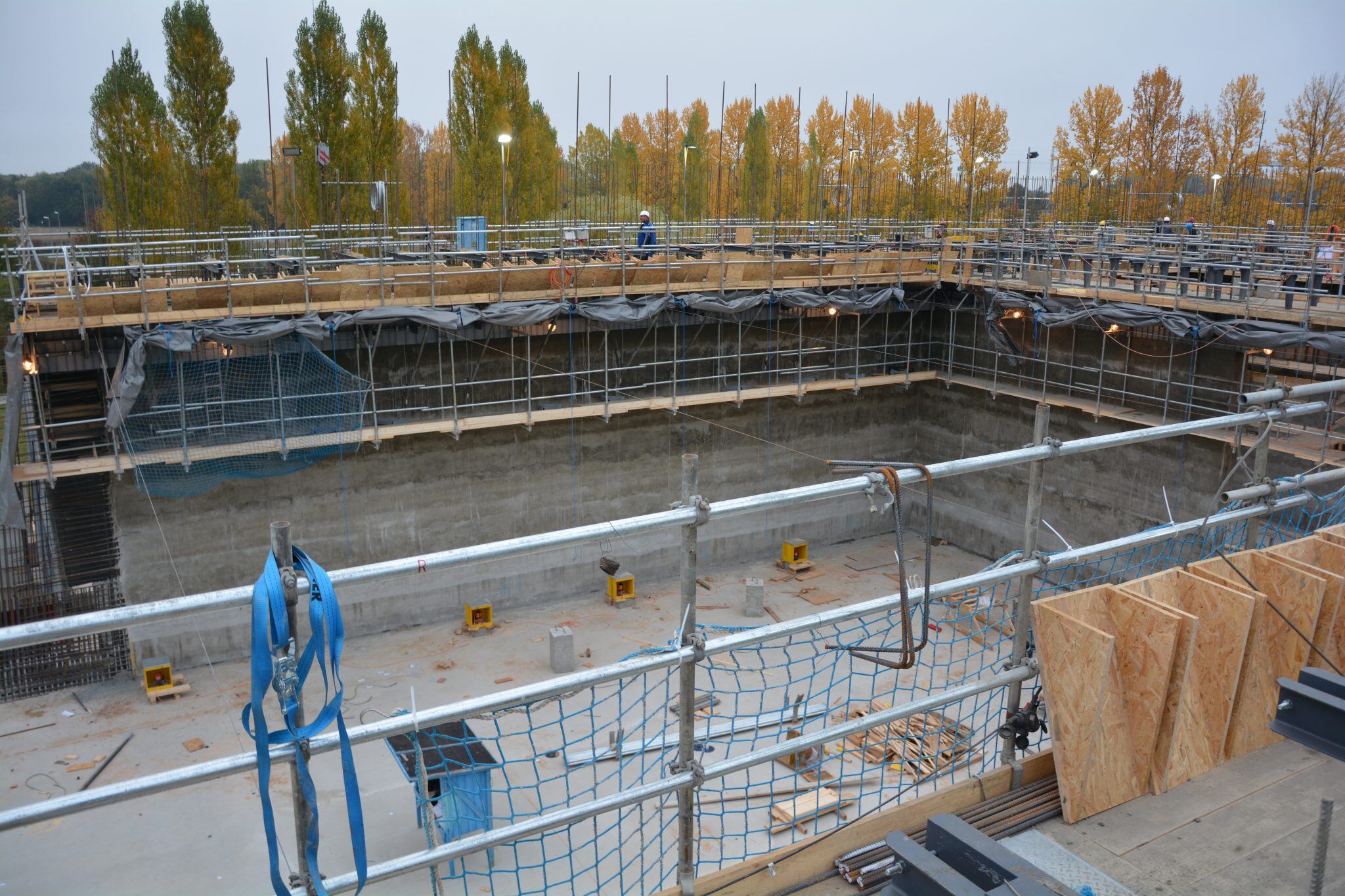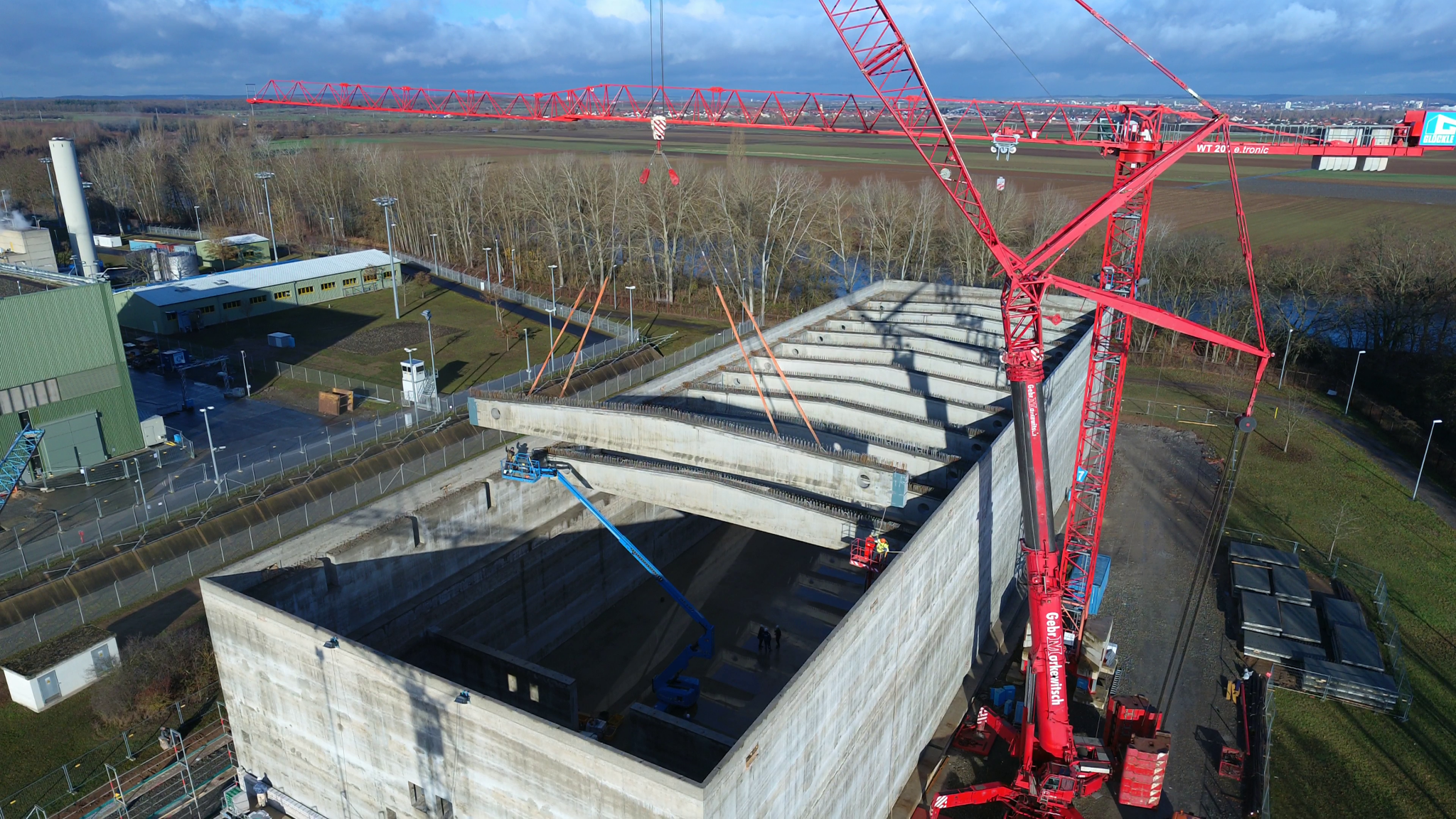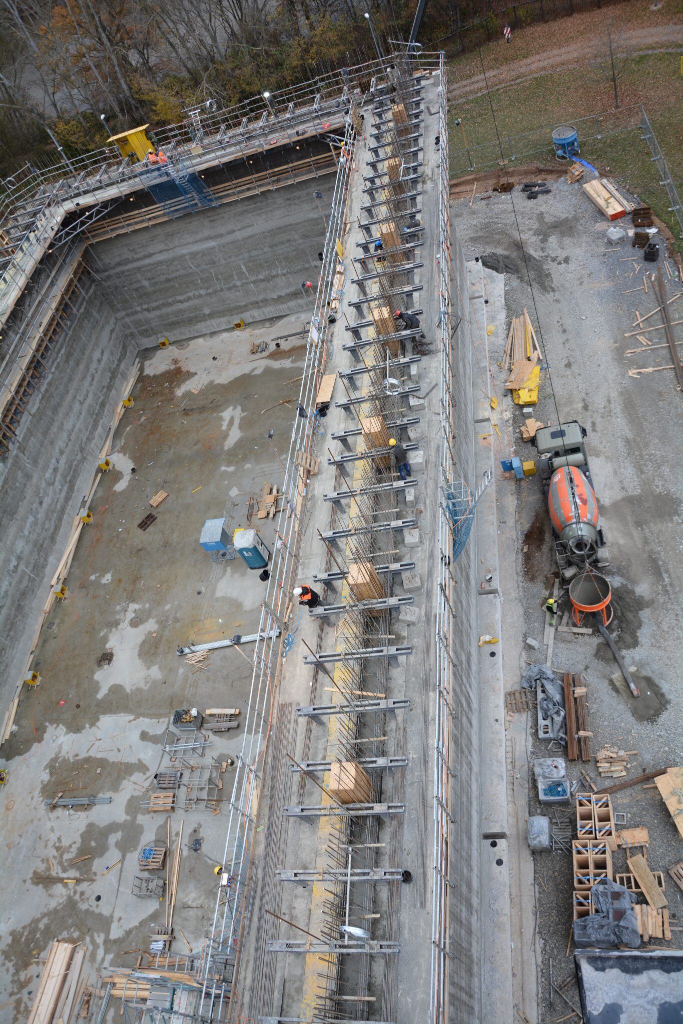 Eine besondere Herausforderung bei der Ausführung war die fugenlose (außer einer Arbeitsfuge in der Mitte) Herstellung der Außenwand mit einer Höhe von rund 17 m und der über 100 m langen Bodenplatte.