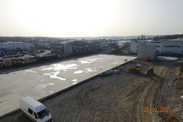Die Ausführung der Bodenplatte war für Anfang Oktober 2020 geplant. Der Beton wurde von der SCHWENK Beton Mainfranken aus dem Werk Würzburg und Transportbeton Beuschlein aus dem Werk Randersacker geliefert. Der Arbeitsbeginn war am 16. Oktober 2020 in den frühen Morgenstunden. Der Einbau erfolgte mit einer maximalen Liefermenge von 80 m³/h. Das Ausbreitmaß wurde auf ca. 520 mm eingestellt.