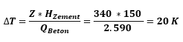 Der Wert für Hzement stammt aus der Eigenüberwachung des Zementes und stellt die Gesamthydratationswärme nach 57 Stunden, ermittelt durch isotherme Wärmeflusskalorimetrie (TAMAIR), dar. Demnach beträgt die maximale Temperatur im Kern bei einer Frischbetontemperatur von 17 °C:
