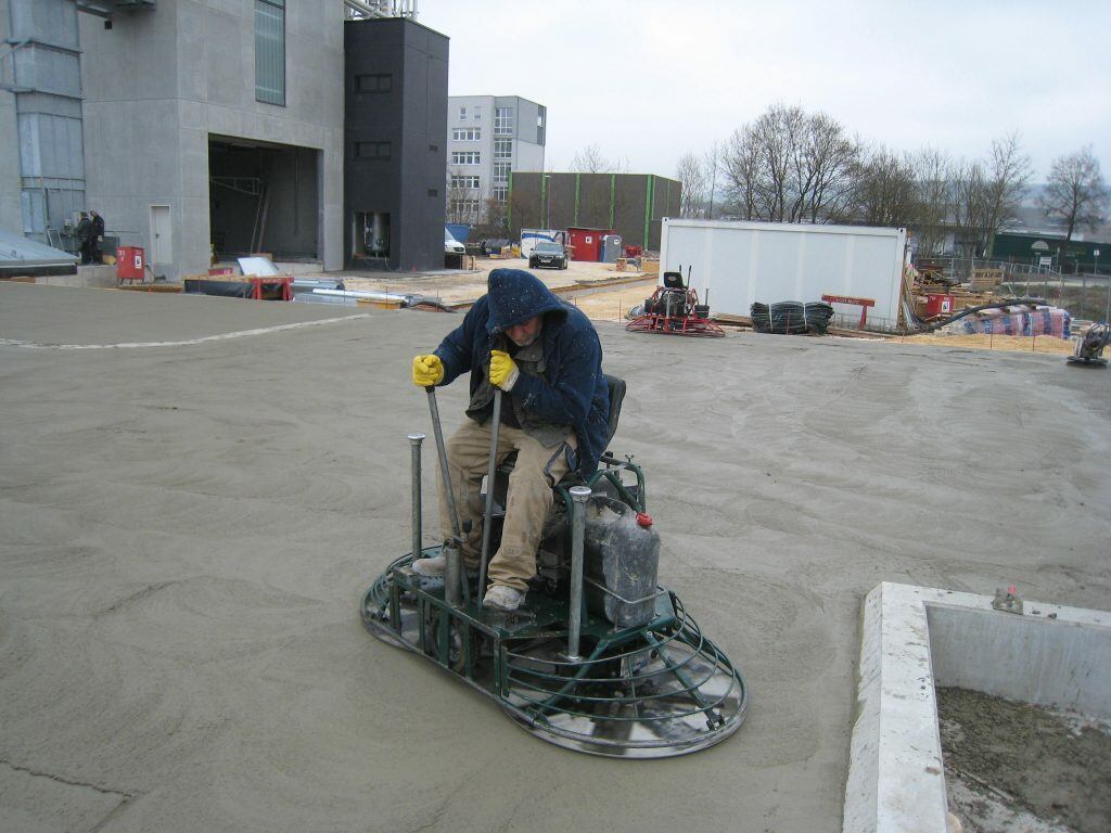 Nach langen Diskussionen hat man sich schließlich einvernehmlich auf die Konsistenzklasse F3 geeinigt. Der Beton musste pumpfähig sein. Um dann die geforderte Ebenheit der Flächen zu erreichen, sollte der Beton nach dem Abziehen mit der Alulatte zusätzlich mit einer Glättmaschine mit Telleraufsatz leicht geglättet werden. Anschließend erfolgt der Besenstrich.