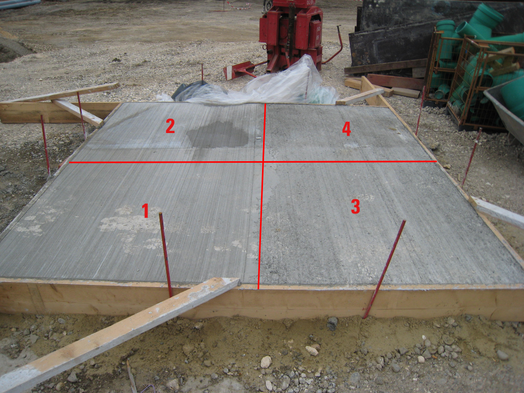 Um die Einbauweise hinsichtlich ihrer Dauerhaftigkeit zu testen hat die SCHWENK Bauberatung gemeinsam mit dem Technologiezentrum zusätzlich eine Reihe von Versuchen durchgeführt. Neben einem CDF-Test an eigens hergestellten Probekörpern wurde auch eine separate Testfläche auf der Baustelle errichtet. Dabei wurden 4 Testfelder mit folgenden Einbausituationen hergestellt:
