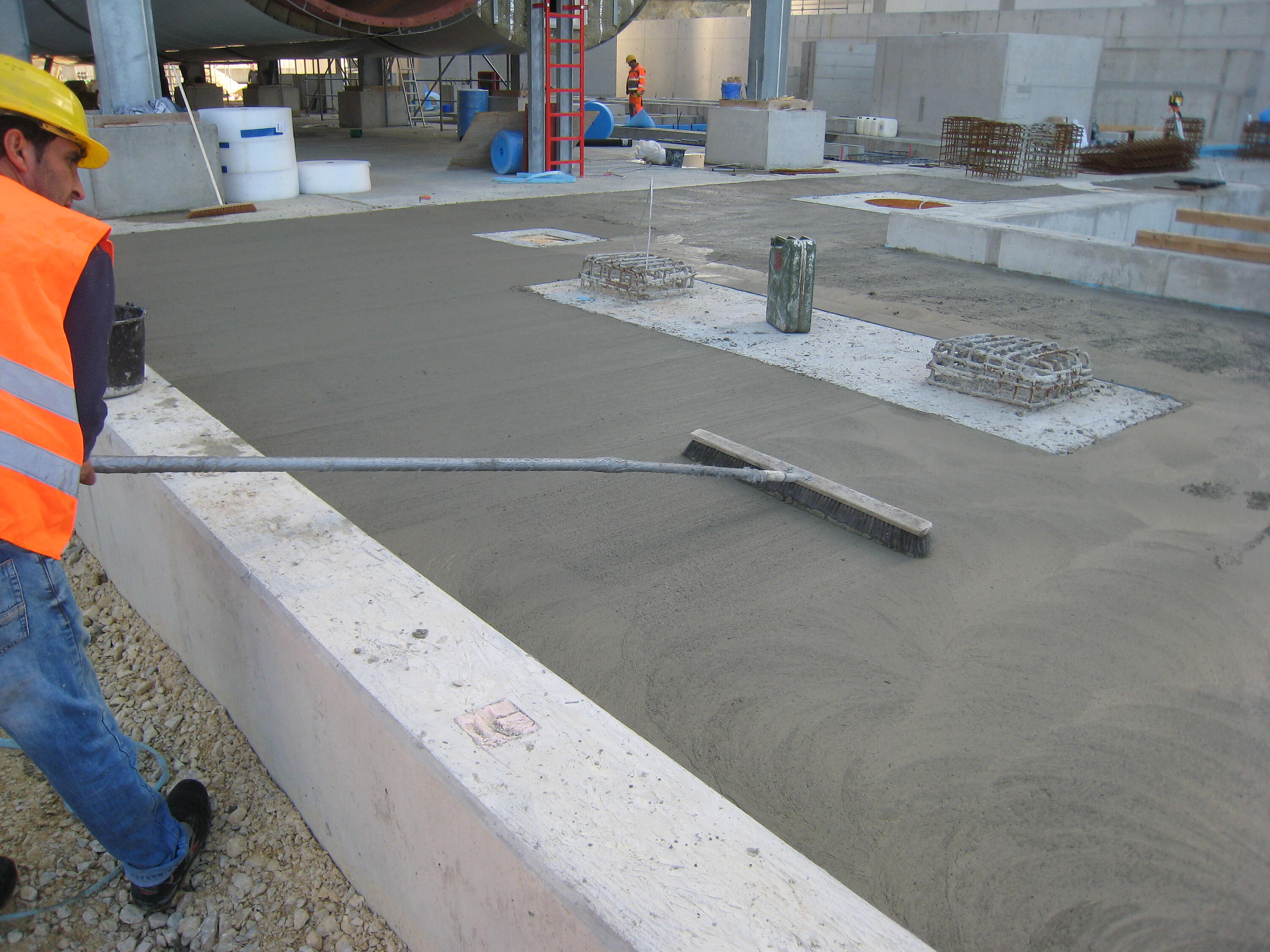 Nach langen Diskussionen hat man sich schließlich einvernehmlich auf die Konsistenzklasse F3 geeinigt. Der Beton musste pumpfähig sein. Um dann die geforderte Ebenheit der Flächen zu erreichen, sollte der Beton nach dem Abziehen mit der Alulatte zusätzlich mit einer Glättmaschine mit Telleraufsatz leicht geglättet werden. Anschließend erfolgt der Besenstrich.