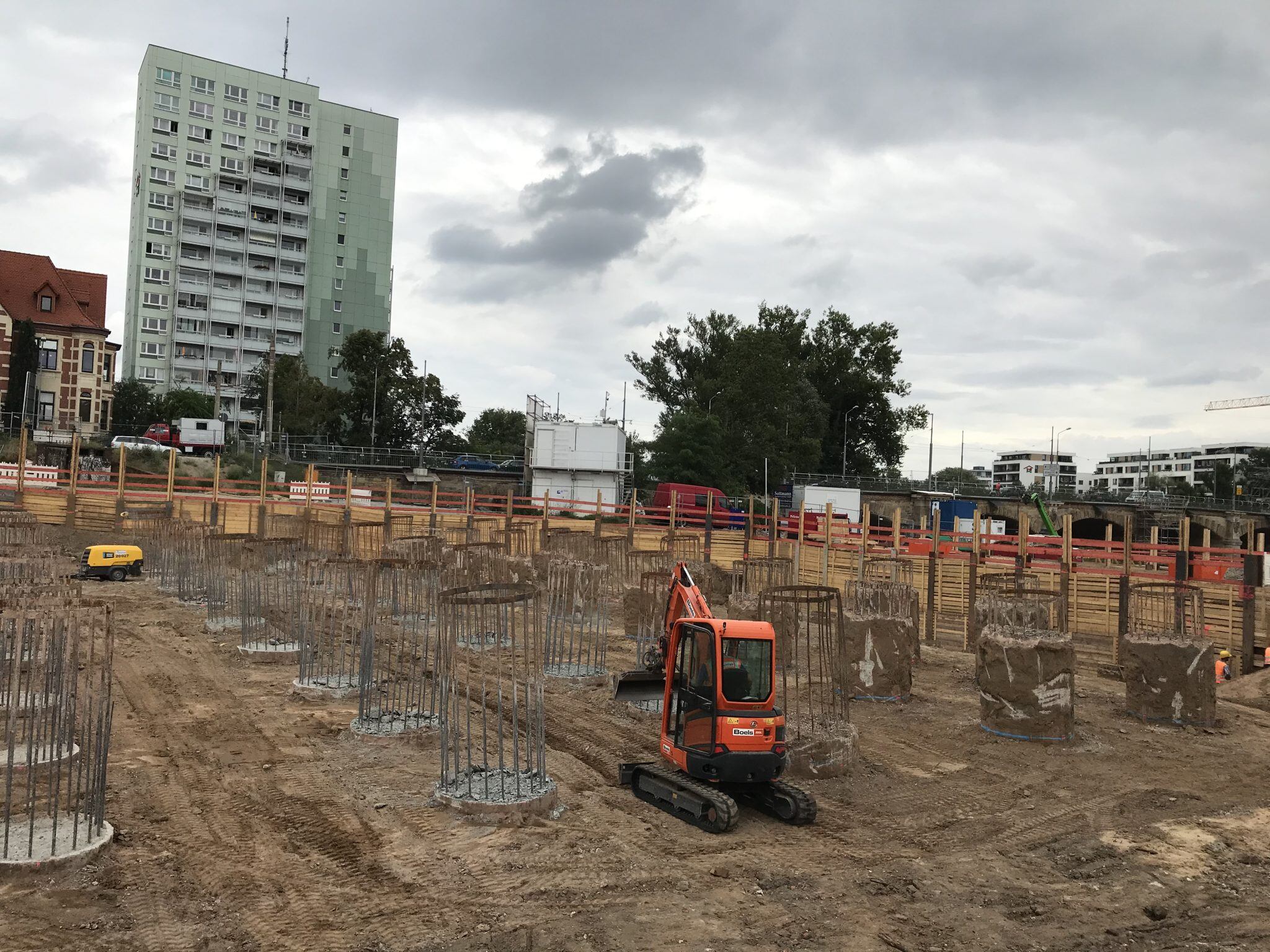 Für diese massiven Fundamentbereiche waren hinsichtlich der Betontechnologie umfangreiche Vorbereitungen und Versuche erforderlich. Da es sich bei den einzelnen Ebenen der Pfahlkopfplatten um sehr massige Bauwerksteile handelt, war besonders hinsichtlich der Hydratationswärmeentwicklung eine erhöhte Aufmerksamkeit geboten. Die Differenz zwischen Kern- und Randbereichen sollte hierbei 15 Kelvin nicht überschreiten, um Temperaturspannungen und somit Risse im Beton zu vermeiden. Für die Rezeptur der Pfahlkopfplatten als Massenbeton der Druckfestigkeitsklasse C30/37 mit den Expositionsklassen XC4, XD2, XF2, XA2 wurde ein CEM III/A 32,5 N-LH (na) der SCHWENK Zement GmbH & Co KG, Werk Bernburg, und eine Steinkohlenflugasche verwendet.