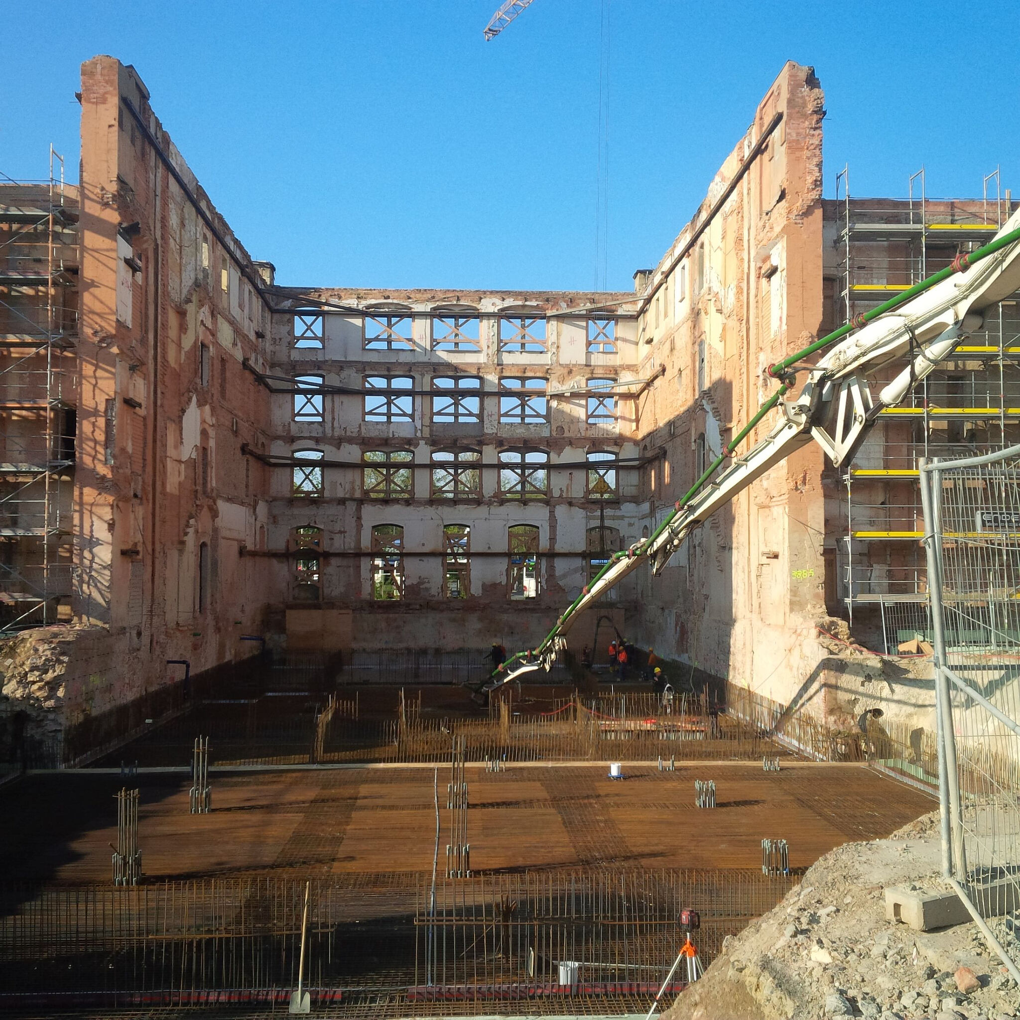 Die Bodenplatte des Mittelbauwerkes wurde auf Grund des hohen Bewehrungsgrades in einem FLOW6 betoniert.Bauunternehmen