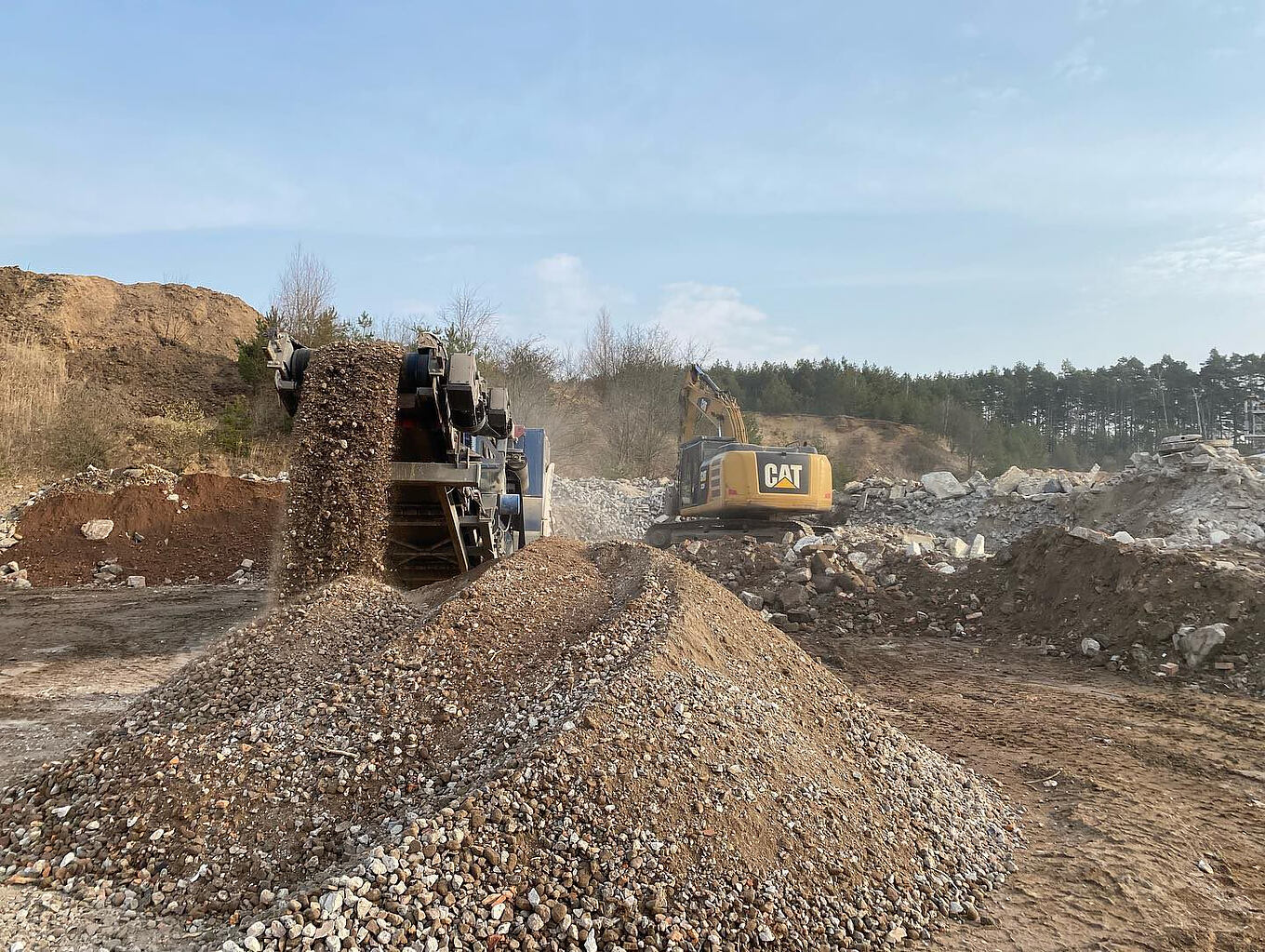 Im Werk Schlagsdorf wurde das Material anschließend durch die Firma Ritter – Service GmbH weiterverarbeitet. In einem ersten Schritt wird das Abbruchmaterial auf eine Größe von 0-45 mm gebrochen. Diese Vorgehensweise ist bereits bekannt, da in der Vergangenheit am Standort Schlagsdorf die Herstellung von Betonrecycling für Tragschichten ohne Bindemittel im Straßenbau öfter realisiert wurde.